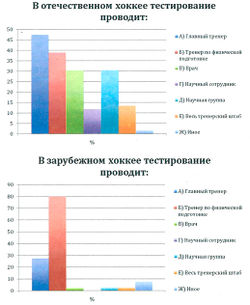 В зарубежном хоккее ситуация отличается: полномочия чётко разделены между всеми представителями тренерского штаба. Именно поэтому в подавляющем большинстве (80%) за тестирование отвечает тренер по физической подготовке. Главный тренер участвует в процедуре тестирования в 28% команд. Врач, научная группа или весь тренерский штаб привлекаются лишь в 3% команд.