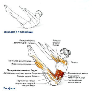 - Сильно втяните живот, чтобы избежать прогиба в пояснице и переднего наклона таза, когда мышцы, сгибающие ногу в тазобедренном суставе, отрывают ноги от мата и особенно когда они оказывают помощь в подъеме и опускании туловища во 2-й и 3-й фазах.
