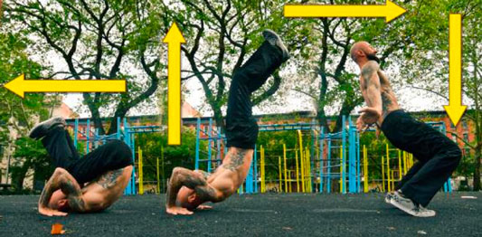 Ловкость — это более сложное явление, оно требует изменения скорости движения, как, например, при подъеме разгибом (стрелками показаны направления приложения силы)