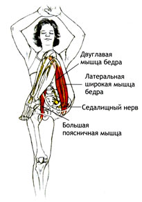 Приведенный ниже рисунок показывает взаимное расположение седалищного нерва и грушевидной мышцы при различных действиях тазобедренного сустава: