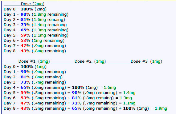 Очень часто возникают разногласия по поводу частоты введения препарата. Так в исследованиях были получены следующие концентрационные кривые при различных дозировках: