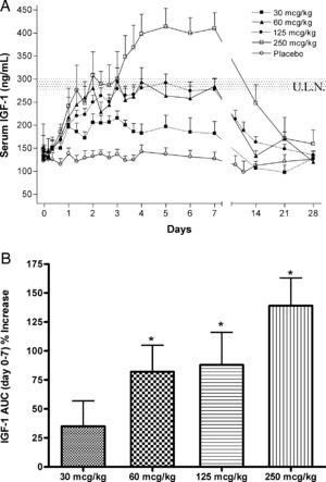 После однократной инъекции CJC-1295 DAC, концентрация гормона в крови увеличивается в 2-10 раз к 6 дню, концентрация IGF-I повышается в 1,5-3 раза к 10 дню. Период полувыведения составляет 6-8 дней. После нескольких инъекций уровень инсулиноподобного фактора роста-1 (ИФР-1) остается повышенным на протяжении месяца. Средняя доза составляет 30-60 микрограмм на кг массы тела, один раз в неделю.[5]