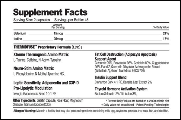 Thermofuse - жиросжигатель комплексного действия, разработанный Muscle Warfare. Новая формула Thermofuse была представлена на выставке Mister Olympia в Лас-Вегасе в 2012 году. Отличительными преимуществами в своем классе не обладает. Большая часть заявленных эффектов преувеличена.
