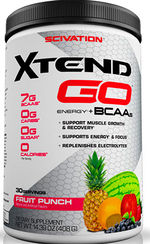 Xtend GO от Scivation содержит аминокислоты с разветвленными боковыми цепями (BCAA) в пропорции 2:1:1 (L-лейцин, L-изолейцин и L-валин), глютамин, цитруллин, электролиты, витамин В6, витамин К и специальный энергетический комплекс.
