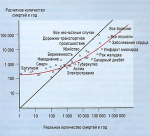 | + | [[Image:Ph_3_2.jpg|300px|thumb|right|Рис. 3.2 Отношение между «принимаемым риском» и «истинным риском» для 41 причины смерти.]] | ||
