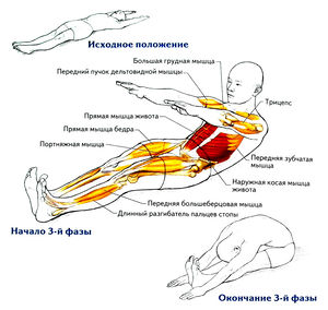 - В конце 3-й фазы скручивания с наклоном вперед сильно втяните живот и контролируйте опускание туловища к ногам с помощью мышц, разгибающих позвоночник и ногу в тазобедренном суставе. Голова при этом находится между руками, а пятки сохраняют постоянный контакт с матом.