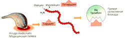 Полипептид гирудин содержится в слюне пиявок (Hirudo medicinalis) и понижает свертывание их «пищи» посредством блокады активного центра тромбина. Действие не зависит от AT III, и поэтому препарат может применяться у больных с дефицитом AT III. Лепирудин идезирудин — аналоги гирудина, произведенные методами генной инженерии. Их можно назначать больным с ГИТ II. Для перорального приема применяют антагонист тромбина ксимелагатран.