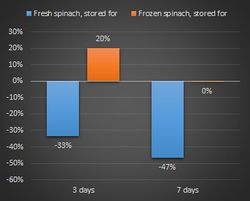 Видно, например, что содержание витамина С практически не меняется, тогда как в свежих продуктах большая его часть теряется за первые несколько дней хранения[2] (таблица на рисунке 2, 47% за 7 дней для витамина С в шпинате). На самом деле еще очень важно, чтобы соблюдались условия перевозки и хранения без размораживания/повторного замораживания[3] , ну это уже вопрос к поставщикам и магазинам. А вот с бета-каротином ситуация хуже - большая его часть теряется и в случае замороженных овощей.