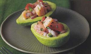 РЕЦЕПТ: Порежьте семгу мелкими кусочками, как для приготовления суши. В глубокой миске смешайте оставшиеся ингредиенты, отставив в сторону авокадо. Добавьте в миску кусочки семги и тщательно смешайте с остальным содержимым. Поставьте миску в холодильник и охлаждайте не менее часа, пока кусочки семги не пропитаются получившимся маринадом и не потемнеют. Когда начинка будет готова, очистите авокадо от кожицы и разрежьте пополам. Выньте сердцевину и ложкой чуть углубите центральную выемку. Используйте половинки как емкости и выложите в них содержимое миски.