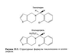 Стимуляторами пуриновых рецепторов служат внеклеточные нуклеотиды. Пуриновые Р2У-рецепторы тромбоцитов относятся к суперсемейству рецепторов, сопряженных с G-белками и содержащих семь трансмембранных доменов. Р2У1-рецептор сопряжен с Gq-белком. Связывание АДФ этим рецептором вызывает расщепление ФИФ2, изменение формы и агрегацию тромбоцитов. Связывание АДФ с Р2У12-рецептором, сопряженным с Gi-белком, ингибирует аденилатциклазу, снижая содержание цАМФ. Судя по фармакологическим исследованиям, для активации тромбоцитов нужна стимуляция обоих рецепторов (Daniel et al., 1998; Jin and Kunapuli, 1998), поэтому блокада любого из них нарушает функцию тромбоцитов. Представитель тиенопиридинов тиклопидин (рис. 55.5) блокирует Р2У12-рецепторы, сопряженные с Gj-белком. По-видимому, препарат представляет собой предшественник, превращаемый микросомальными ферментами печени в еще не установленный активный метаболит. Тиклопидин обладает высокой биодоступностью и быстро всасывается. Антиагрегантное действие достигает максимума не ранее чем через 8— 11 сут после начала лечения. Поэтому в некоторых исследованиях для ускорения действия препарата использовали насыщающую дозу в 500 мг (обычная доза — по 250 мг 2 раза в сутки). Антиагрегантное действие сохраняется в течение нескольких суток после отмены препарата.