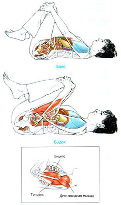 Прижимание коленей к туловищу на выдохе стимулирует расслабление диафрагмы. Как правило, это упражнение выполняется только за счет использования мышц живота и мышц, сгибающих тазобедренные суставы. Можно также расслабить мышцы бедер и живота и использовать руки для подтягивания коленей к груди.