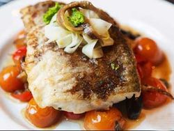 Пока рыба запекается, подготовить пюре: отварить в течение 15 минут помидоры с лавровым листом, измельченным чесноком, тимьяном и мелко порезанным луком-шалотом. Пропустить смесь через блендер. Подавать рыбу с получившимся соусом.