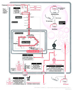 Секреция инсулина, возникающая под действием глюкозы, носит двухфазный характер. Первая фаза достигает максимума через I —2 мин и длится недолго, вторая начинается не сразу, но продолжается длительное время. Механизм, посредством которого глюкоза вызывает секрецию инсулина, до конца не изучен. Первым делом глюкоза должна попасть внутрь β-клеток и метаболизироваться (Matschinsky, 1996).