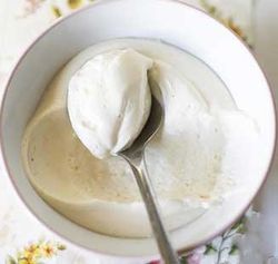 Для приготовления крема отделить белки от желтков. Взбить белки до густой пены (можно добавить щепотку соли). Смешать йогурт с желтками и заменителем сахара. Аккуратно соединить желтки с белками.