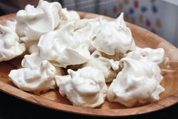 Белки отделить от желтков и взбить до достаточно густой пены. Добавить разрыхлитель и несколько капель лимонного сока. Снова взбить. Важно, чтобы белки были охлажденными, иначе они будут плохо взбиваться.