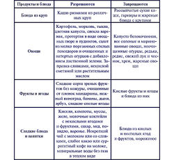 - Запрещаются: изделия из сдобного теста; жареные мясо и рыба, обвалянные и сухарях; мясные, грибные и другие закусочные консервы; сырые овощи и фрукты; бобовые; молоко в натуральном виде, черный хлеб, газированные напитки, сало, гусь, утка, соления, копчения, маринады, очень горячие и холодные блюда.