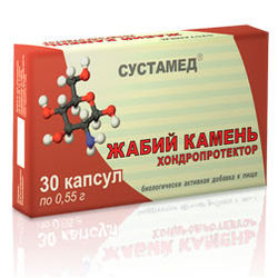 Когда говорят о Жабьем камне, обычно подразумевают известный биобальзам (мазь) "Жабий камень с маслом рыжика" - являющийся хондропротектором, то есть препаратом для восстановления тканей хряща. Бальзам от Сустамед "Жабий камень" создан на растительной основе. Основным компонентом явлется многолетник семейства лютиковых Чистяк или Жабий камень - отсюда и название бальзама. Он содержит кальциевые соли арабиковой кислоты - вещества, которое влияет на кальциево-фосфорный обмен веществ. Экстракт рыжика содержит витамин Е, эвкалипт и красный перец разогревают область воздействия бальзама, конский каштан усиливает кровообращение.