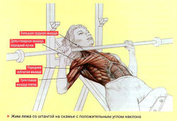 - На скамье с положительным углом наклона — задействуются преимущественно верхние части грудных мышц.