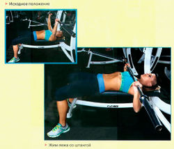 Женщинам полезнее выполнять жим лежа на скамье с положительным углом наклона или на тренажере, который воспроизводит это движение, так как данный вариант задействует верхние части грудных мышц, а также передние пучки дельтовидных мышц. Как говорилось выше, женщинам разумнее работать над самой заметной частью груди. Более того, поскольку во время выполнения этого упражнения передние пучки дельтовидных мышц получают непрямую стимуляцию, вам не придется тренировать их отдельно. Поэтому упражнение на скамье с положительным углом наклона не только дает больший эффект, но и экономит время. Обратите внимание, что, поскольку здесь усилия сосредоточены преимущественно на верхней области груди, вы не можете работать с таким большим весом отягощений, как в тех случаях, когда выполняете это упражнение на горизонтальной скамье или скамье с отрицательным углом наклона.