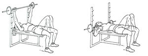 Снимите штангу со стоек. Сгибая руки в локтевых суставах, опустите гриф к верхней части груди. Вернитесь в исходное положение, полностью выпрямив руки. Повторите упражнение.