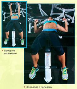 Особенно осторожно следует выполнять жим лежа с гантелями. Чтобы защитить спину от травм, поднимая гантели с пола и переходя в исходное положение, сначала положите их на бедра, согнув руки. Опуская гантели на пол, внимательно следите за тем, чтобы не выпрямлять руки и не уронить гантели, поскольку в этом случае вы порвете бицепсы.