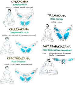 Положение, в котором колени скрещенных ног находятся выше уровня тазобедренных суставов, рекомендуется принимать тем, у кого закрепощены отводящие мышцы бедра. Колени в этом случае разводятся под действием веса бедренных костей, увеличивая подвижность тазобедренных суставов.