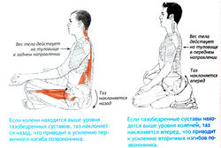 Если же ограничена подвижность в задней части таза, то колени, находящиеся выше уровня тазобедренных суставов, наклоняют его вперед и заставляют позвоночник сгибаться в поясничном отделе. Чтобы придать туловищу вертикальное положение, необходимо задействовать мышцы спины или мышцы, сгибающие ноги в тазобедренных суставах. Они в таком случае быстро утомляются.