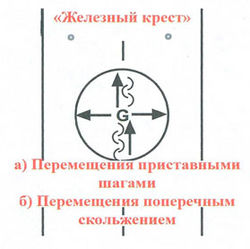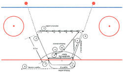 Испытуемый занимает положение основная стойка вратаря на центральной начерченной линии, которая служит стартом и финишем. По свистку или иному заранее оговоренному сигналу вратарь выполняет мощный толчок правой ногой и перемещается поперечным скольжением на левом щитке к линии слева (Рисунок 57,1). Коснувшись её коньком, голкипер, совершая толчки левой ногой, перемещается к противоположной крайней линии поперечным скольжением на правом щитке (Рисунок 57, 2). Коснувшись её коньком, испытуемый выполняет мощный толчок правой ногой и финиширует на центральной линии (Рисунок 57, 5).