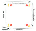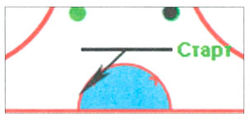 Испытуемый занимает положение основная стойка вратаря за стартовой линией лицом к световым индикаторам. По сигналу вратарь выполняет поворот на 45° и перемещение поперечным скольжением на щитке в направлении загоревшегося индикатора (Рисунок 58); коснувшись коньком границы площади ворот, совершает полное торможение и поперечным скольжением на другом щитке возвращается на стартовую линию, где принимает положение основная стойка. Всего в ходе теста испытуемый должен среагировать на 4 сигнала устройства поперечным скольжением на щитках в указанном направлении. Финиш фиксируется на стартовой линии в момент принятия голкипером основной стойки вратаря.