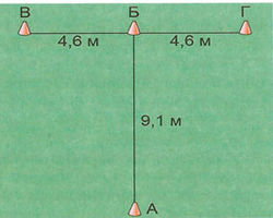 Для выполнения теста необходимо наличие секундомера, двух конусов, шайбы, а также хоккейных ворот. Шайба находится за воротами, конусы устанавливаются на расстоянии четырёх метров от линии ворот согласно схеме на рисунке 61.