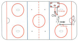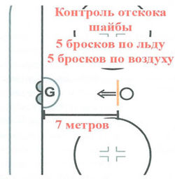 Для выполнения теста необходимо наличие 10 шайб и хоккейных ворот. В 7 метрах от линии ворот чертится линия броска, где устанавливаются шайбы.