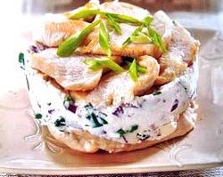 Разогреть духовку до 180 °С (термостат 6). Нарезать тонкими полосками филе индейки. Смешать творог с луком, мелко нарезанной петрушкой, толченым чесноком. Полить лимонным соком. Приправить солью и перцем. Выложить мясо слоями в форму с антипригарным покрытием, чередуя с творогом так, чтобы верхним слоем была индейка. Выпекать в духовке 20 минут на водяной бане. Подавать горячим.