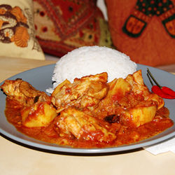 Снять кожу с курицы, нарезать ее на кусочки и положить в сковородку с антипригарным покрытием. Смешать остальные Ингредиенты и добавить к курице. Накрыть крышкой. Тушить на медленном огне 1,5 часа. Приправить по вкусу. При необходимости в конце варки снять крышку с кастрюли, чтобы соус немного выпарился.