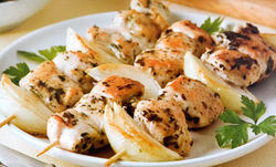 Кусочки курицы и дольки лука поочередно нанижите на шампуры, обжарьте на гриле.