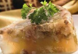 Процеженный бульон поставить на огонь, добавить разведенный желатин и тщательно перемешать. Разогреть бульон,но не доводить до кипения. Аккуратно залить мясо бульоном. Убрать в холодильник застывать. Подавать с хреном или горчицей.