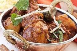 Обжарить бедрышки, предварительно сняв с них кожу, на среднем огне в слегка смазанной маслом большой сковороде. Добавить мелко нарезанный лук и измельченный чеснок. Смешать йогурт со смесью четырех специй и карри, затем вылить в сковороду к курице. Накрыть крышкой и тушить на слабом огне 50 минут. Затем добавить палочку корицы, тмин, кардамон, шафран и кайенский перец. Тушить еще 30 минут. Выложить бедрышки на горячее блюдо. Процедить соус, а затем довести его блендером до однородной консистенции. Залить полученным соусом бедрышки и сразу же подавать.