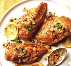 Пассеровать мелко нарезанный лук на слегка смазанной маслом сковороде с антипригарным покрытием, затем снять его со сковороды и выложить на тарелочку. На той же сковороде на среднем огне обжаривать кусочки курицы в течение 15 минут. Добавить обжаренный лук, лимонную цедру, каперсы, лимонный сок, базилик, соль и перец. Подавать горячим.