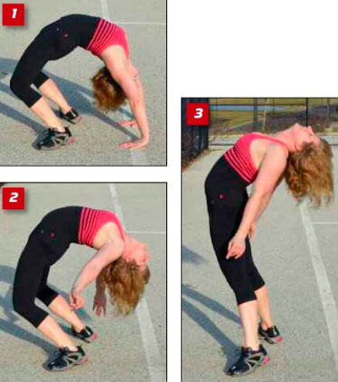 Подоприте поясницу руками и начните опускаться назад, стараясь посмотреть назад, не поворачивая при этом головы. Продолжайте, стараясь увидеть пол у себя за спиной. Когда вы будете у цели, уберите руки с поясницы и обопритесь на них.