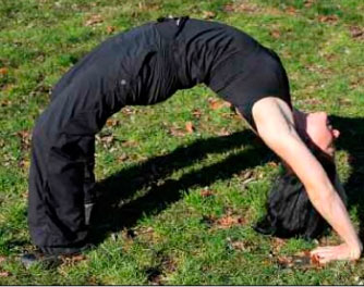 Это упражнение отличается от подъема с мостика: для его выполнения необходимо «продолжить» падение из спада назад и, встав в мостик, не останавливаясь двигаться дальше, чтобы в итоге оказаться на ногах. Очень непростое упражнение, особенно для людей с малоподвижными спиной и плечами.
