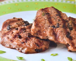 Подготовленное мясо обжарьте на гриле. При подаче мясо выложите на блюдо и посыпьте рубленой зеленью.