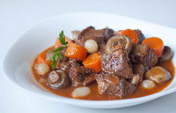 Тем временем очистить и мелко порезать маленькие луковицы. В две луковицы воткнуть бутончики гвоздики и добавить весь лук в мясо. Выпекать около 30 минут в духовке при температуре 190 °С (термостат 5-6). Подавать в том же блюде.