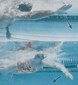 Пол (вверху) вот-вот начнет давить на воду вниз, при этом его рука относительно прямая. Для сравнения взгляните на Мел Бенсон (внизу): она проталкивает воду назад, сгибая руку в локте