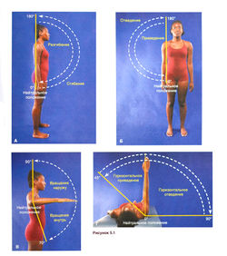 Рисунок 5.1. Объем движений в плечевом суставе. А. Сгибание и разгибание. Б. Отведение и приведение. В. Вращение наружу и внутрь. Г. Горизонтальное отведение и приведение.