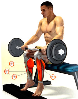 Мышцы, работающие при подъеме на носки из положения сидя со штангой на коленях: 1 — икроножная; 2 — камбаловидная; 3 — передняя большеберцовая; 4 — длинный разгибатель пальцев