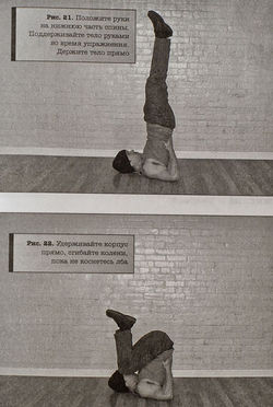 Лягте на пол, согните колени. Оттолкнитесь от пола, помогая себе руками, поднимите ноги вверх и затем выпрямите. В этой позиции поддерживайте нижнюю часть спины руками, плечи должны упираться в пол. Помните — необходимо всегда поддерживать тело руками во время выполнения упражнения. Избегайте любой нагрузки на шею. Держите тело прямо, не сгибайте колени. Это исходное положение (рис. 21). Удерживая корпус прямо, сгибайте колени, пока не коснетесь лба. Это конечное положение (рис. 22). Выпрямив ноги, вернитесь в исходное положение. Повторите.