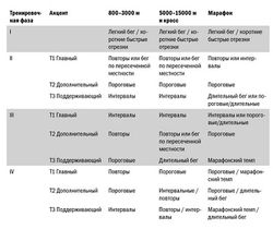 В табл. 4.1. приведены примеры того, как могут быть скомпонованы программы для бегунов, специализирующихся на разных дистанциях. Здесь приведены только общие схемы, поскольку очень важно учитывать индивидуальные особенности каждого бегуна и строить его программу в соответствии с ними. Я поддерживаю тех тренеров и бегунов, которые на ранних фазах каждого сезона в первую очередь работают над общей физической формой, скоростью работы ног и хорошей механикой бега.