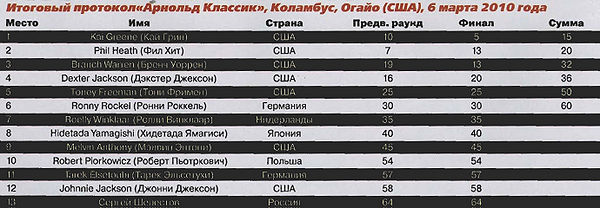 первым и вторым. Каждый был хорош в строго определенных позах: Грин «выносил» всех со спины и в «широчайших спереди», Фил Хит, как ни странно, был лучше в передних позах, особенно most muscular. Свои «коронки» были и у Дэкстера. Не забываем про Бренча Уоррена, так же кардинально отличающегося от вышеупомянутой троицы, как скульптура из гранита отличается oт скульптур из мрамора (сравнение не мое, но мне очень нравится). И когда сложение разнится настолько сильно, судьи обращают, в первую очередь, внимание на то, что в английском языке именуется словом conditioning, и чему у нас наиболее близко соответствует словосочетание «качество / рельеф мускулатуры». Мышцы Кая Грина по началу не поразили качеством. Но от сравнения к сравнению он становился все лучше и лучше, все «жестче» и «жестче». Не могу не сказать об одной удивительной особенности Кая. Мне удалось увидеть его фотографии за две недели до старта «Арнольд Классик». Именно опираясь на эти фото я и выдвинул в публикации на сайте нашего журнала предположение, что Кай основную ставку делает на «Олимпию-2010», сосредоточившись на наборе массы. Кстати, такое предположение сделал не только я, но и многие другие обозреватели - уж слишком форма атлета была далека от соревновательной. Но Кай Грин еще раз доказал, что для него нет ничего невозможного, сбросив за две недели примерно 8-9 килограмм (на подиуме в Коламбусе Грин весил примерно 117-118 кило, при том, что в межсезонье его вес приближается к отметке «140») и представ пред судьями и зрителями в форме, близкой к совершенной.