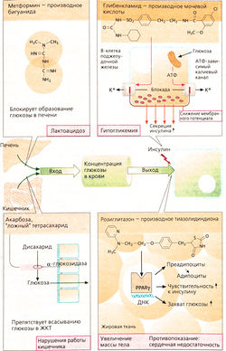 Уровень глюкозы в крови определяется балансом между поступлением глюкозы в кровоток из кишечника и печени и потреблением глюкозы из кровотока органами и тканями. На рис. А приведены группы препаратов, снижающих повышенную концентрацию сахара в крови.