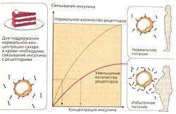 Повышенная потребность обусловлена резистентностью органов к инсулину. Причиной развития резистентности является уменьшение числа (плотности) рецепторов и нарушение в механизме передачи клеточных сигналов от комплекса инсулин-рецептор. Переедание и накопление триглицеридов в жировых клетках также имеют значение, так как при этом в кровь выделяются вещества, снижающие чувствительность к инсулину. Данное снижение чувствительности можно компенсирвоать увеличением концентрации инсулина. На рис. А упрощенно изображено уменьшение плотности рецепторов. У человека с ожирением максимально возможное связывание инсулина (плато на кривой) понижено из-за уменьшения количества рецепторов. Кроме того, при низкой концентрации инсулина связывание с рецепторами слабее, чем в норме. Для реализации определенного процесса в обмене веществ (например, переваривания куска торта) необходимо задействовать вполне определенное число рецепторов. Как следует из приведенных на рис. А графиков, для больного ожирением это достигается при более высокой концентрации инсулина в крови.