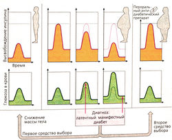 Если человек, имеющий нормальную массу тела (слева) съедает определенное количество углеводов, то для устранения подъема концентрации сахара в крови выделяется инсулин. Человеку с повышенной массой тела для нормализации содержания сахара в крови (диаграммы зеленого цвета) нужна более высокая концентрация инсулина (диаграммы оранжевого цвета). Если способность поджелудочной железы к выработке инсулина уменьшается, то при углеводной нагрузке концентрация сахара в крови повышается (снижение толерантности к глюкозе, латентный сахарный диабет). При дальнейшем понижении выработки инсулина повышается показатель уровня сахара натощак (обнаружение диабета).